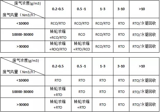 在廢氣風(fēng)量、廢氣濃度和成分知曉的情況下,可以選擇相應(yīng)的處理方式,可以參照下表進(jìn)行選擇(僅供參考):